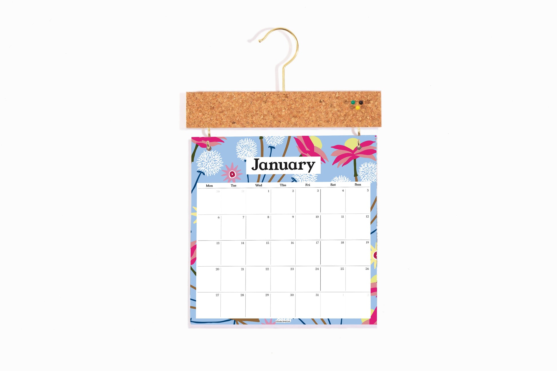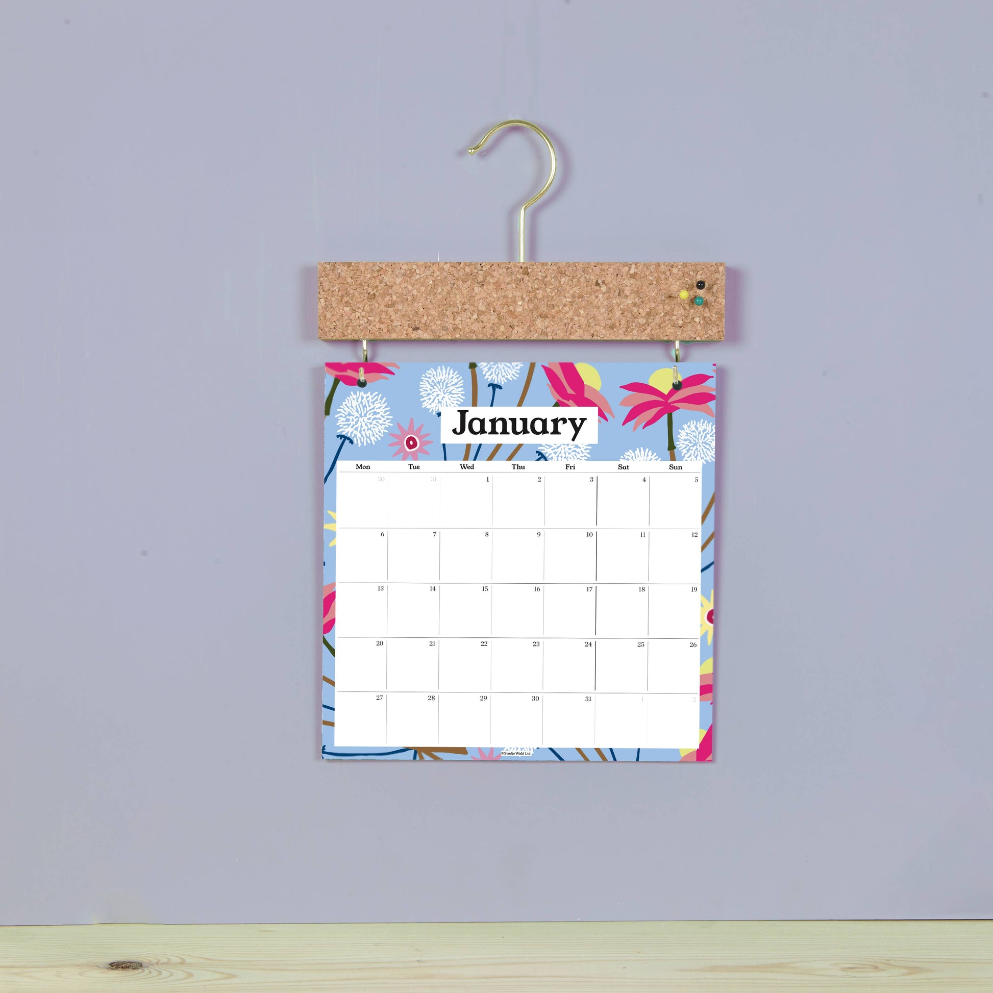 Use the handy cork topper and brass plated hooks to pin memos & reminders for the month displayed. - Colourful floral design. -