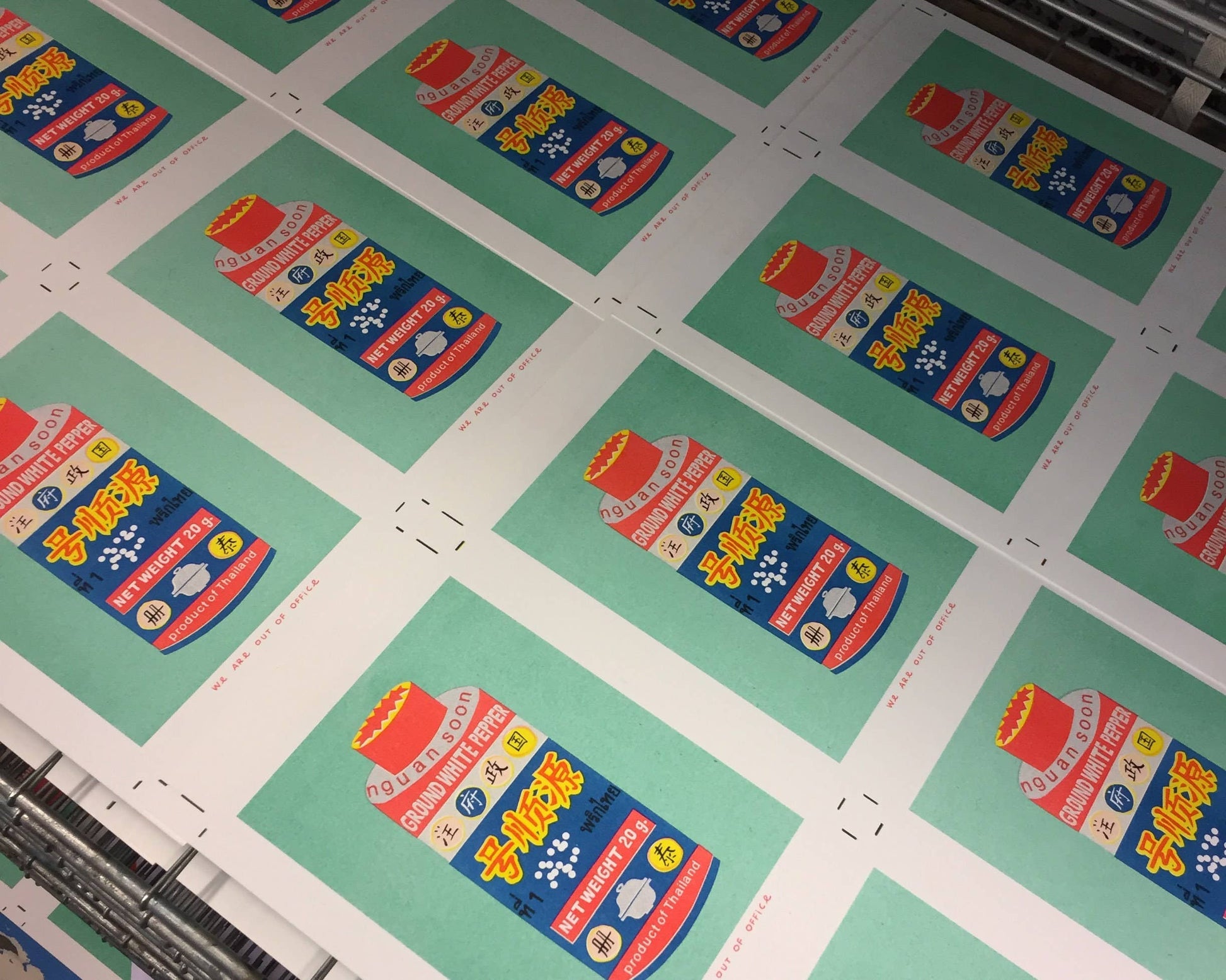 A nicely coloured risograph print of a can of ground white pepper by We Are Out Of Office from the Netherlands.