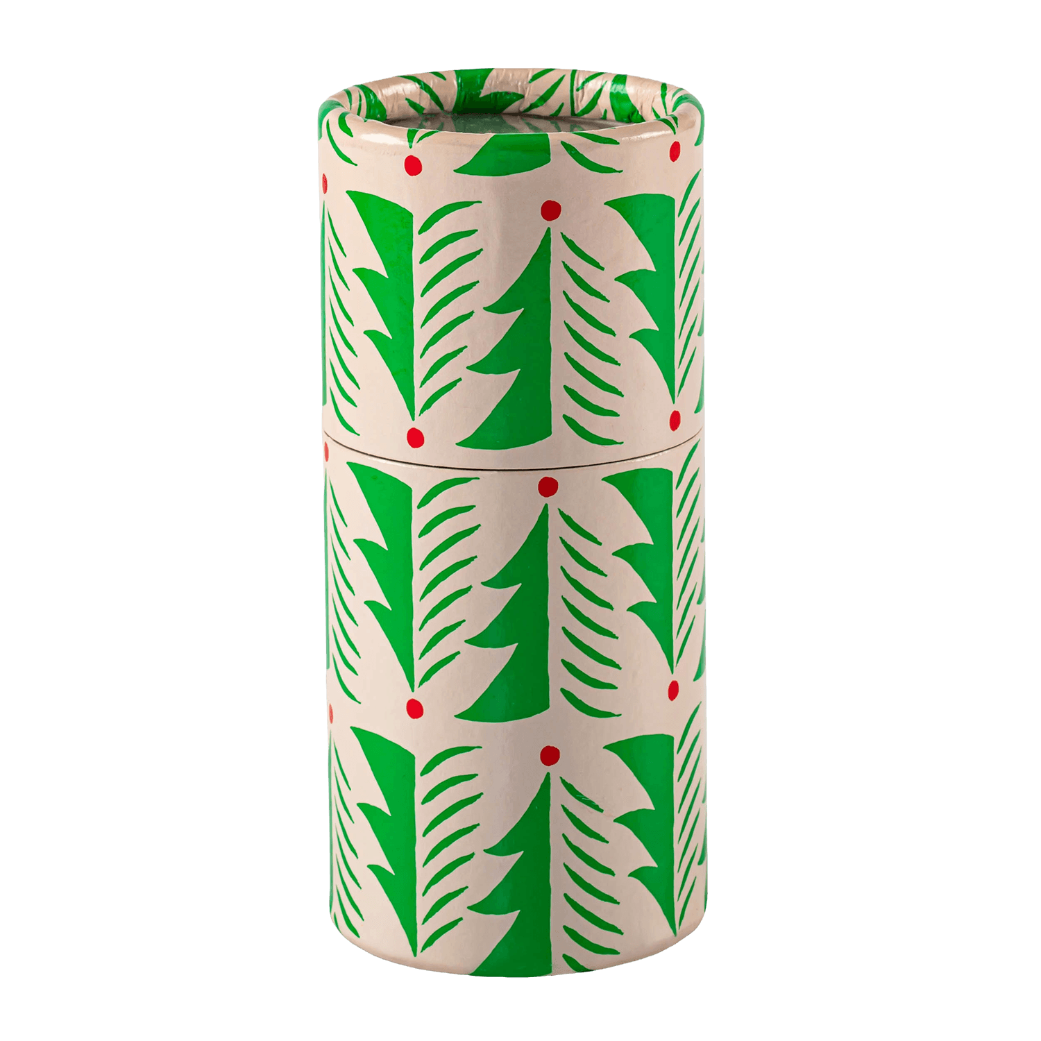 Large cylinder matches featuring green conifer trees with a red bauble perched at the top.