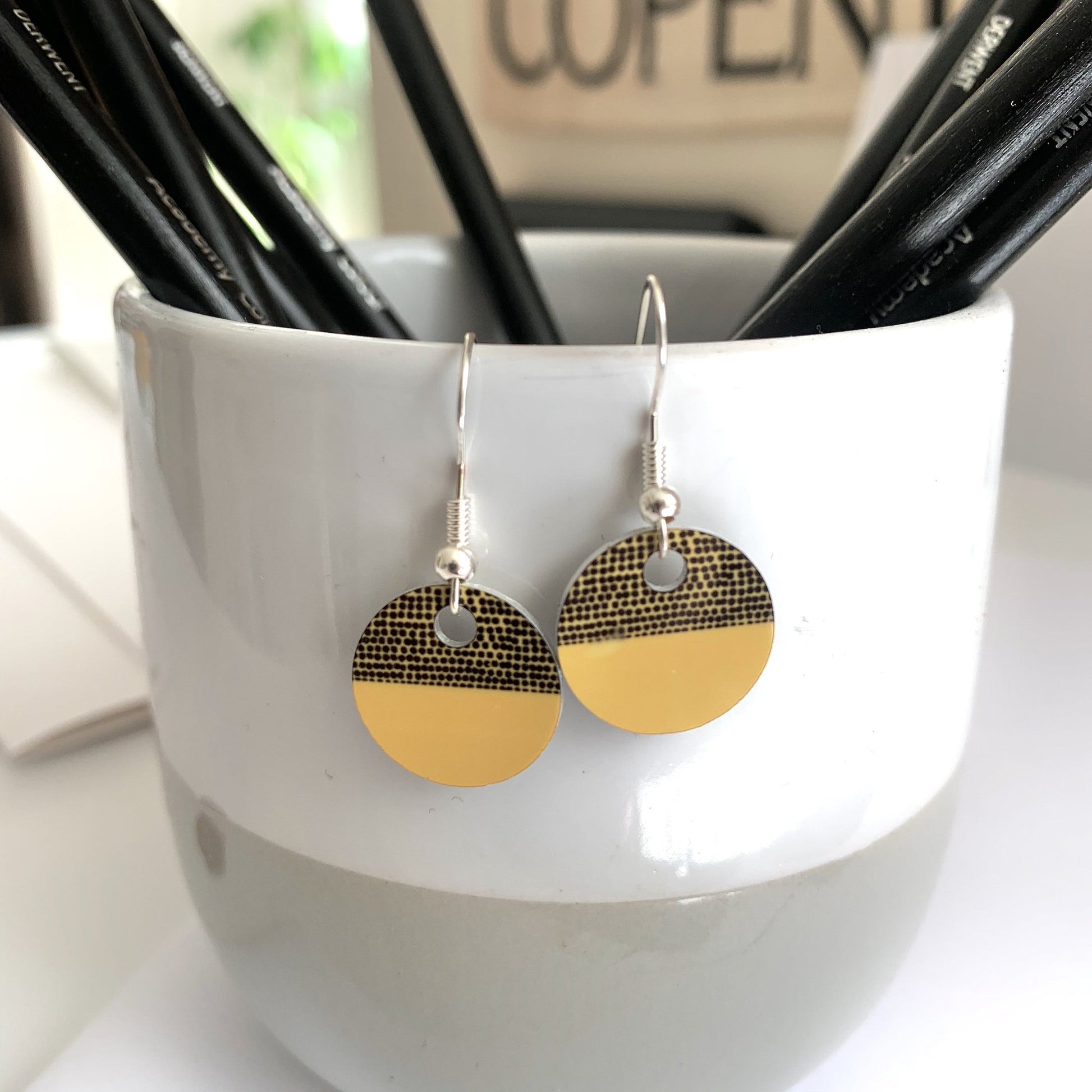 These are colourful hand printed disc shaped earrings featuring printmaking patterns in a contemporary colourway.