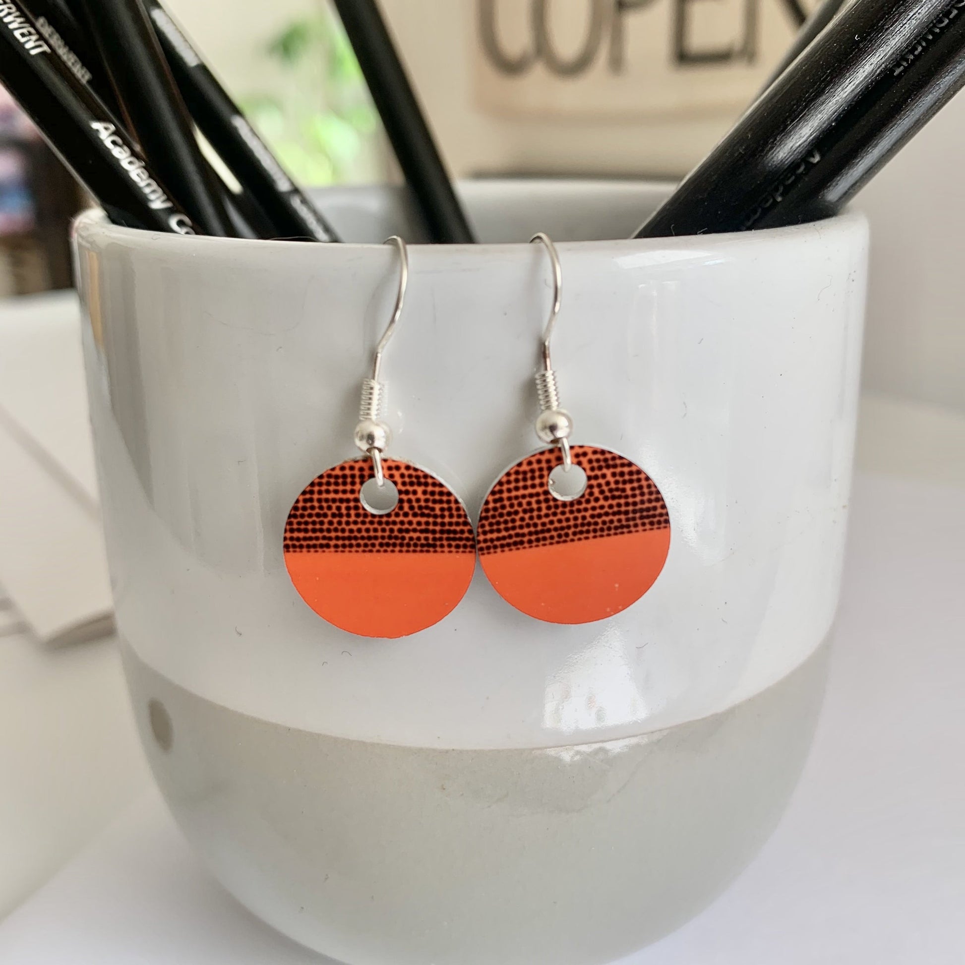 These are colourful hand printed disc shaped earrings featuring printmaking patterns in a contemporary colourway.