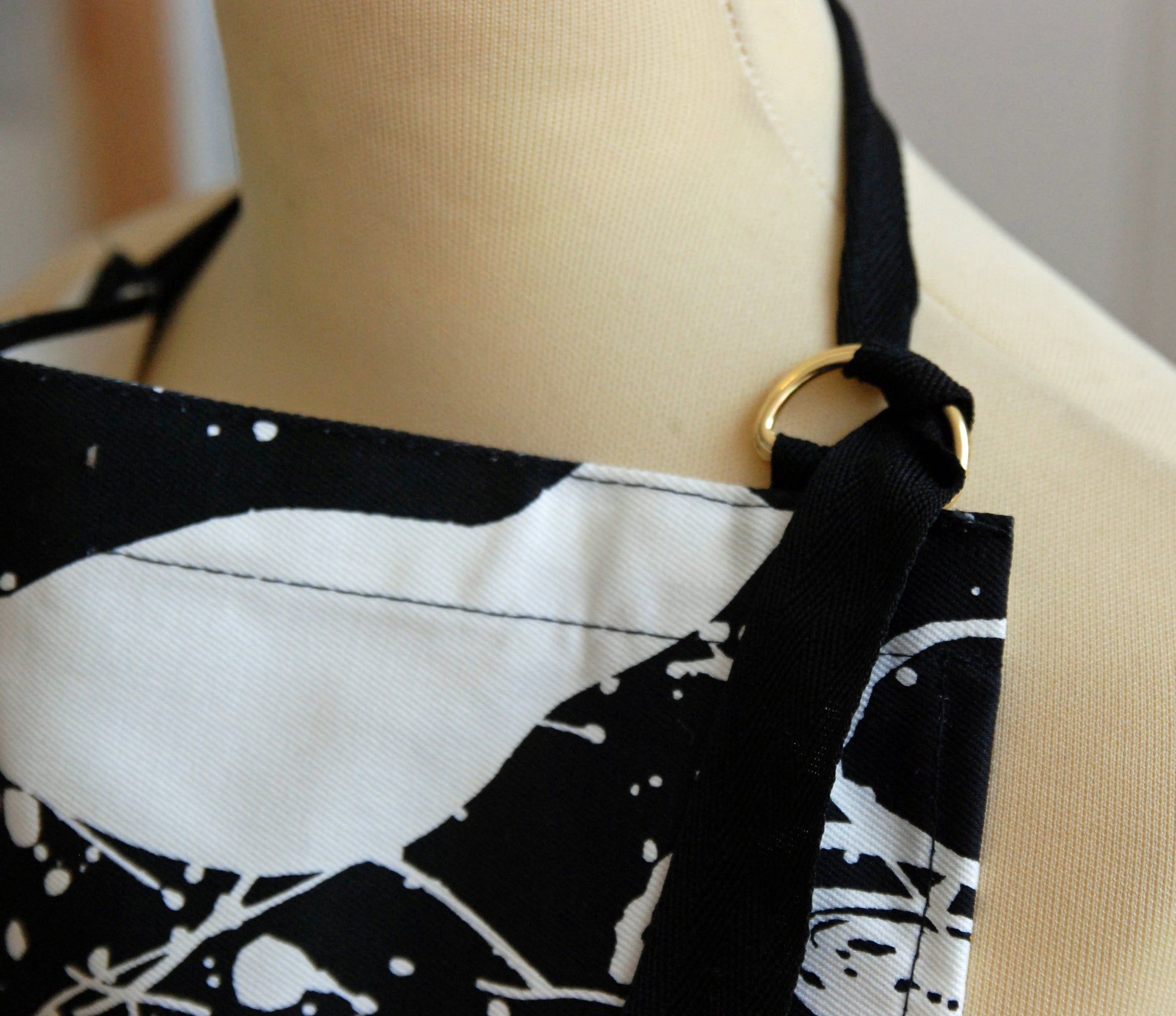 Size- 82cm in length X 60cm at the widest part that's a nice size!!!! Our aprons tie with a strong black grosgrain ribbon and have adjustable fastening around the top that are secured with D-rings.