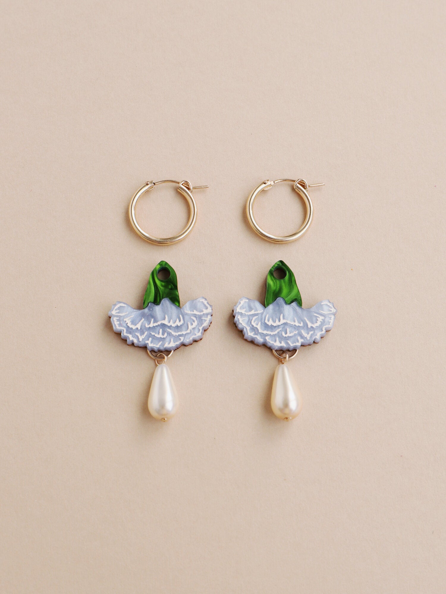 These playful blooms are super lightweight, and are made from acrylic with glass pearl details and hand-inked engravings.