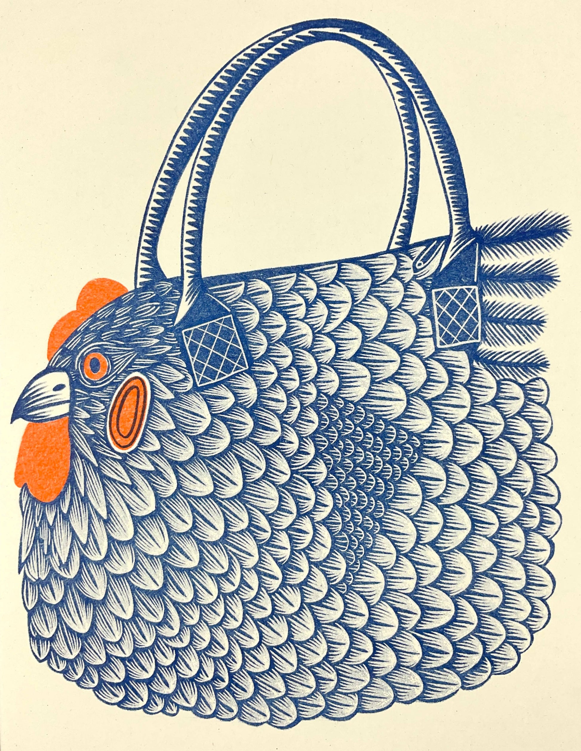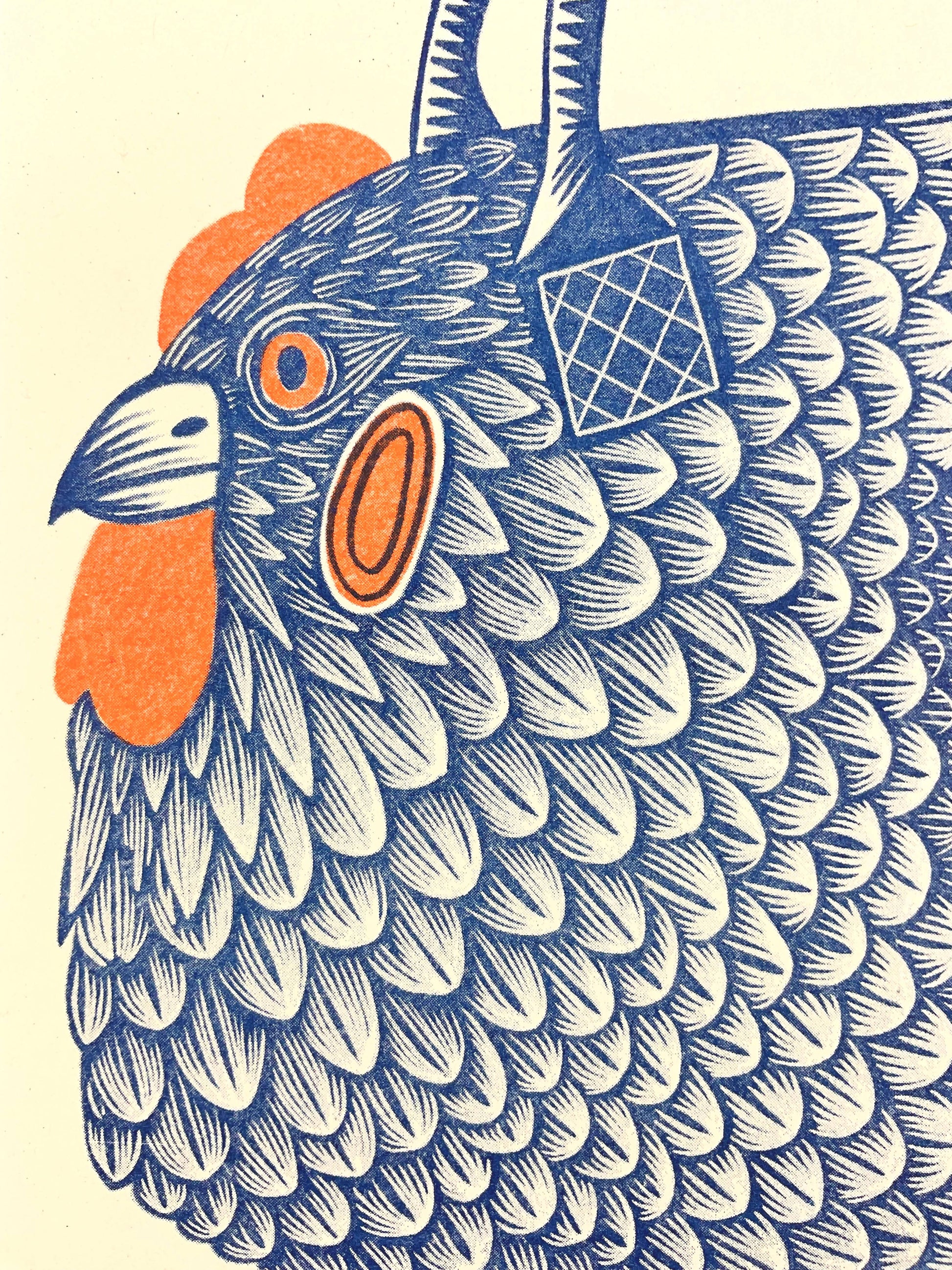 “Chicken Bag” A riso print in dark blue and orange ink.