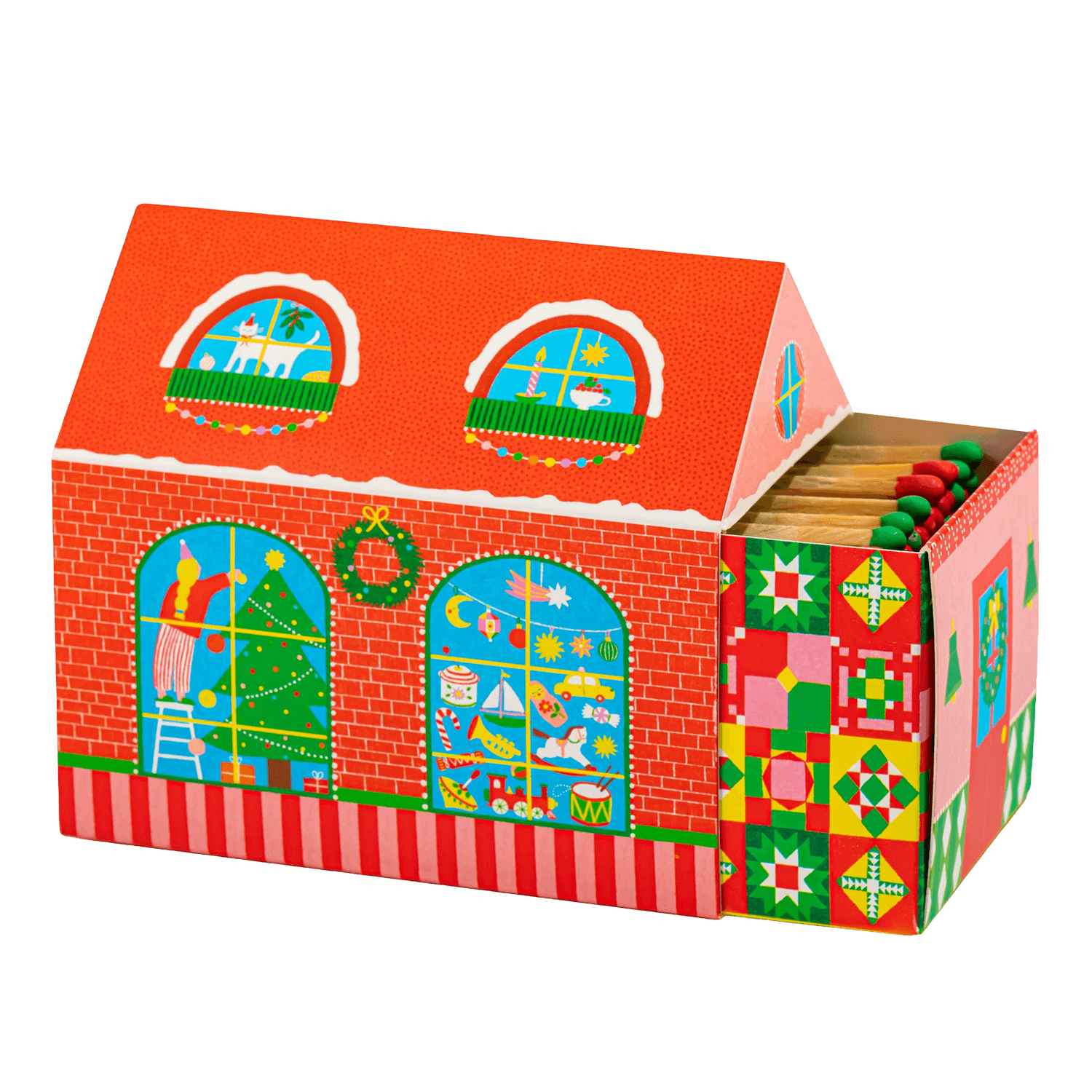 A festive house shaped matchbox designed by Archivist. Featuring the illustration of a red-brick home decorated for Christmas with a woman decorating a tree in the window.