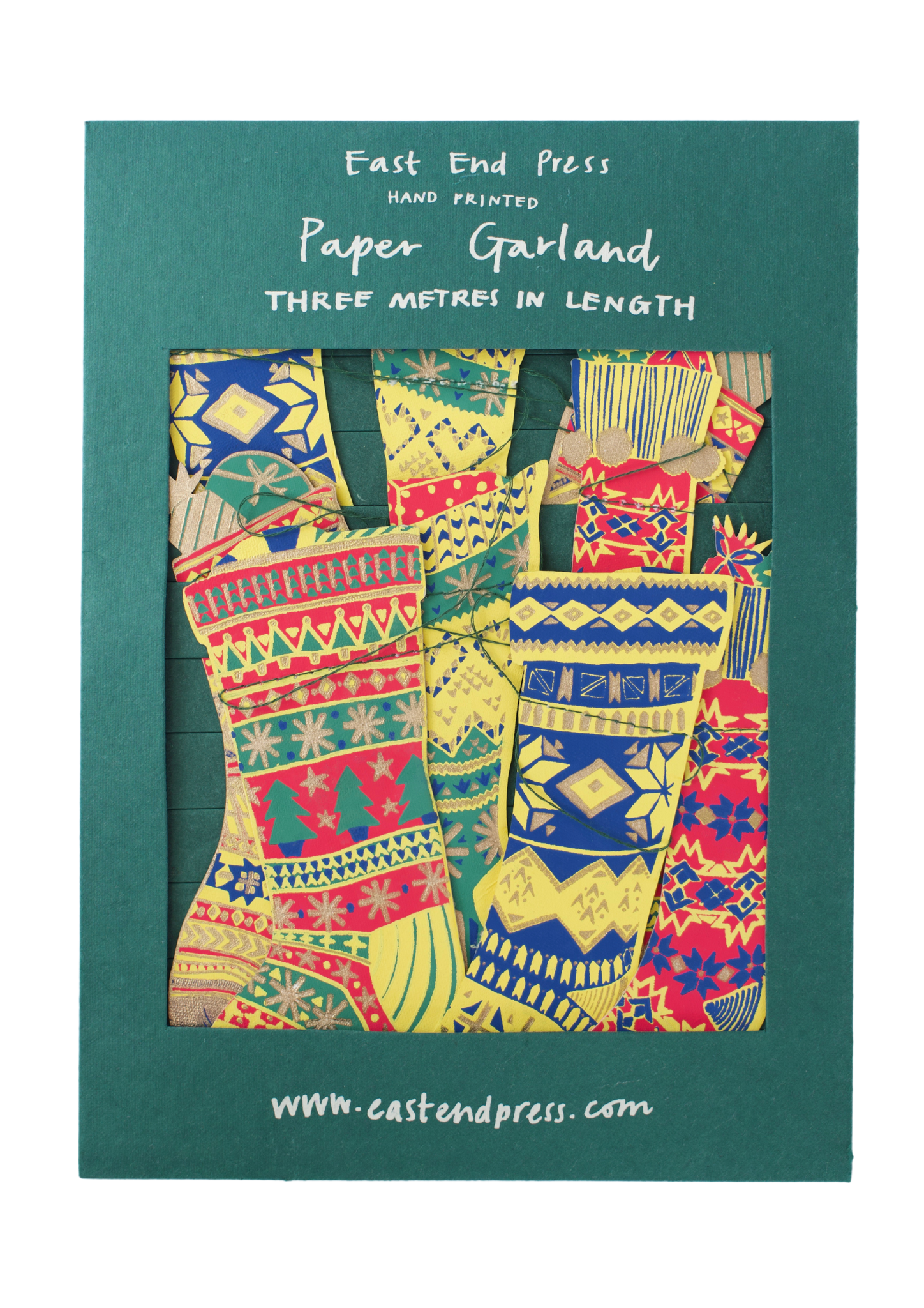 Let the festive fun begin! Our Festive Stockings Garland is a hand-printed 3m-long celebration of colour, ready to hang and bring cheer to your home. Screen-printed onto thick cotton paper and sewn together with strong cotton thread, it features 10 vibrant stockings to add that special Christmas sparkle!