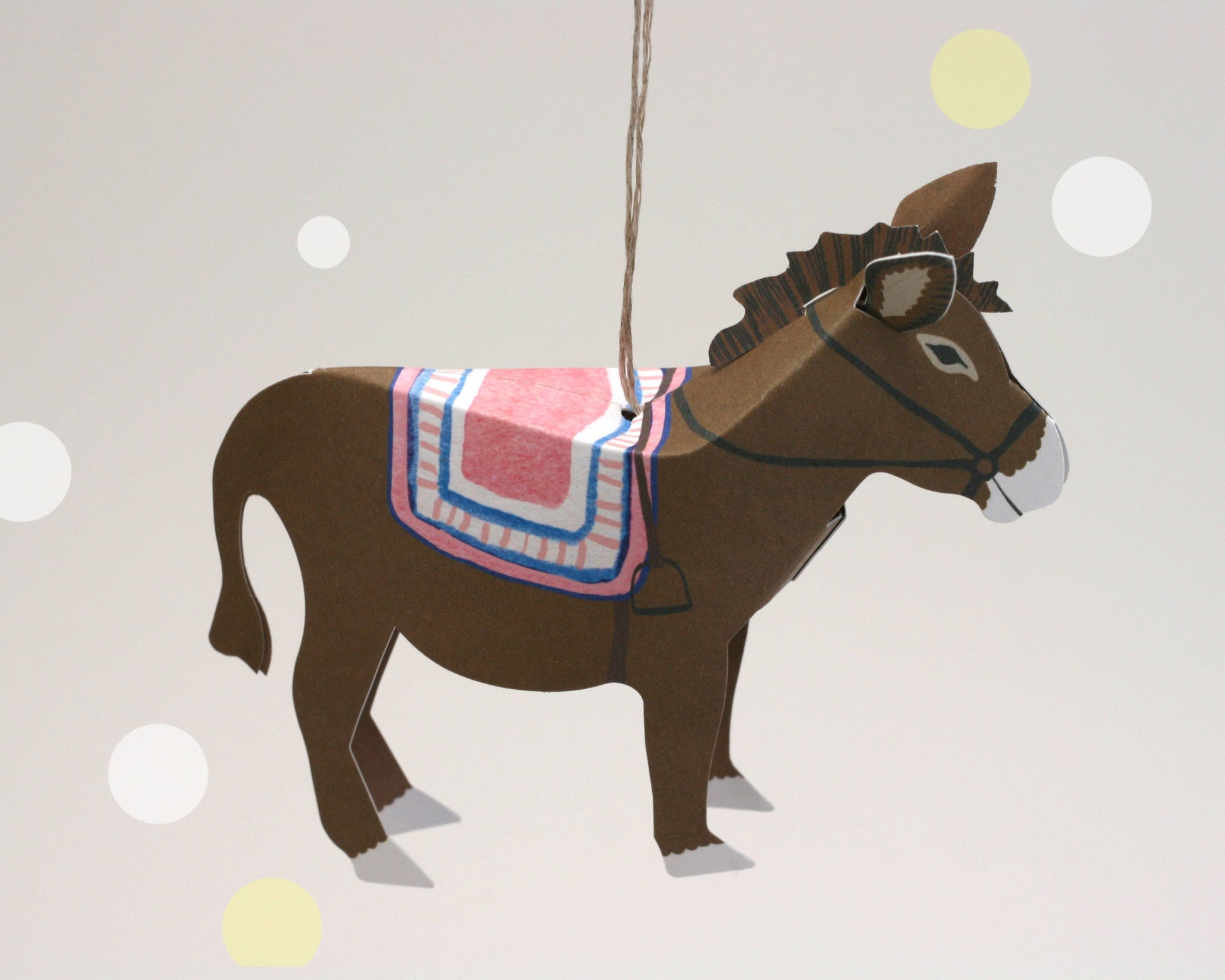 There is no cutting or gluing involved, just pop it up! Simply press the donkey's back to pop it into shape and you have a 3D donkey decoration ready. Once popped up the donkey can be hung on the corner of the card, and when the recipient has finished with the card, the donkey can be kept for years as a separate decoration.