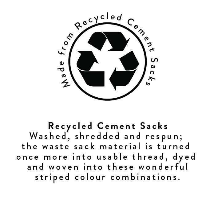 A striped, woven plant pot cover made from recycled cement sacks and re-invented as a stylish house plant pot cover. Just pop over the plant pot, ensuring a water tray is under the pot base to catch any water. Empty cement sacks from the construction industry are collected, washed and shredded. The shredded material is spun into thread, re-dyed & woven into these wonderful pot covers.