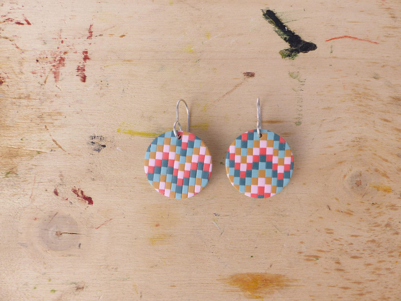 Delicately hand crafted pendant with an intricate geometric pattern in duck and pale blue, light caramel, powder pink and coral.