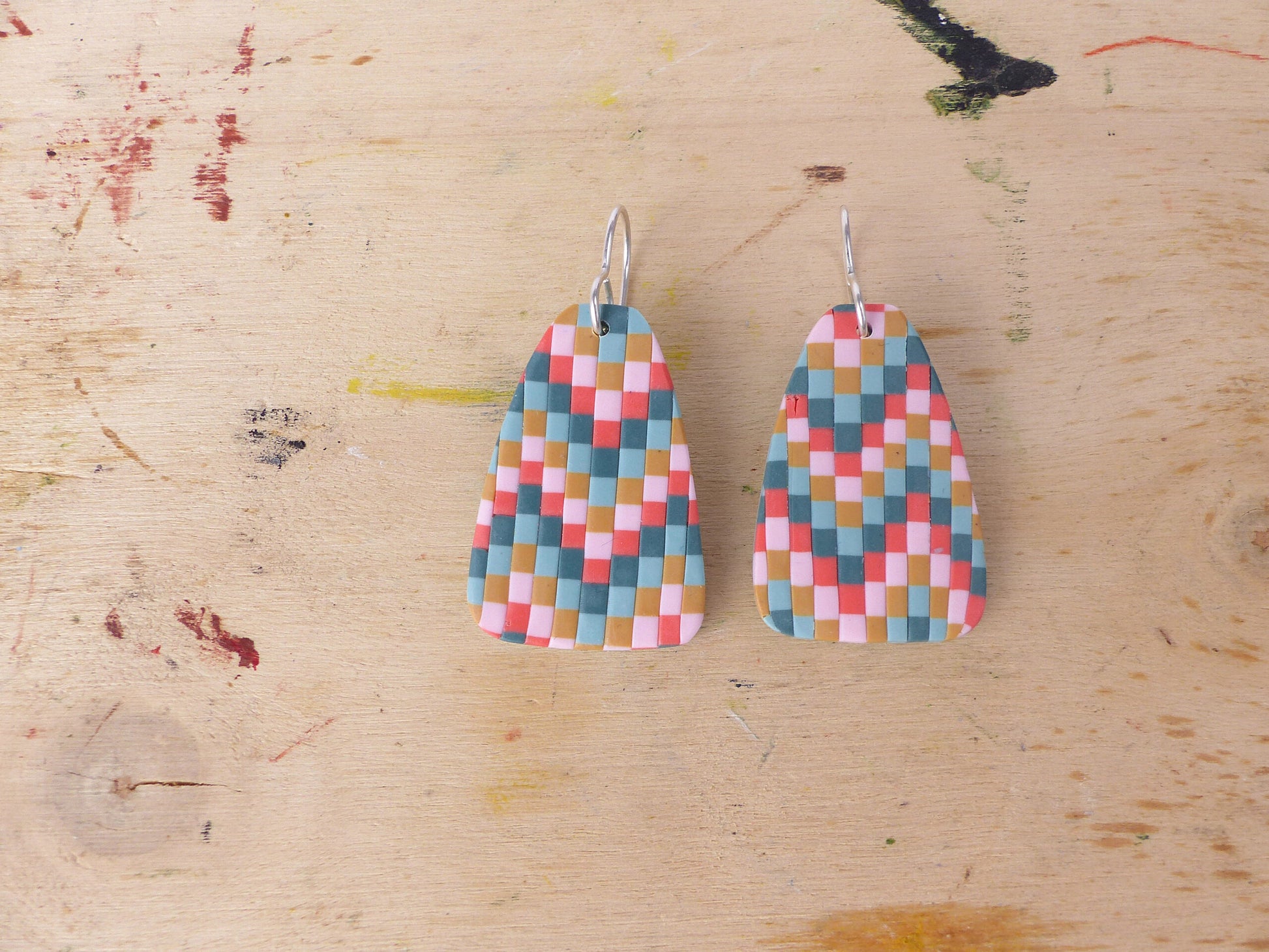 Delicately hand crafted earrings with an intricate geometric pattern in duck and pale blue, light caramel, powder pink and coral.