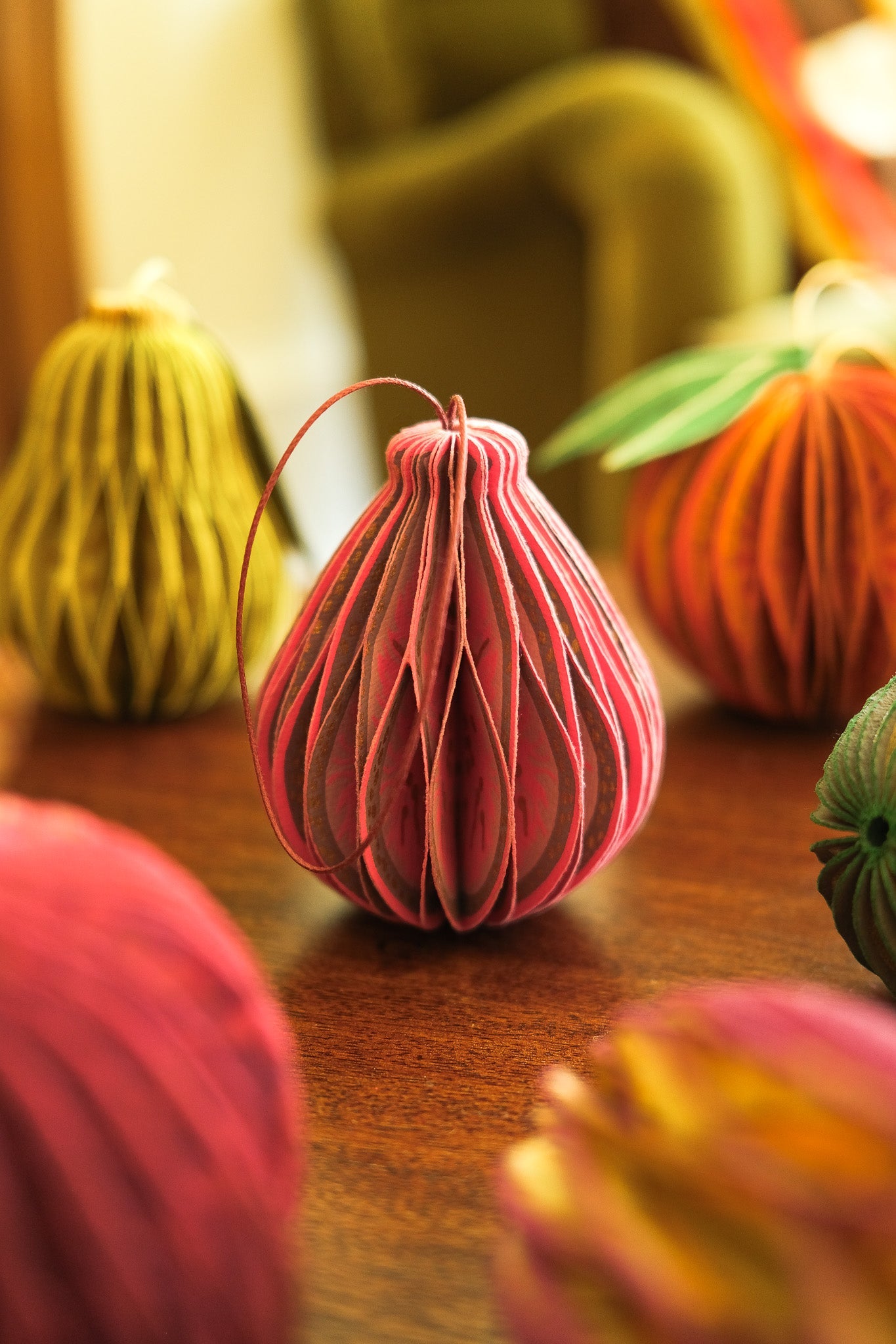 Composed of intricate layers of recycled cotton paper and screen printed by talented artisans in Jaipur. These beautiful decorations are secured by a magnet and hang with a cotton loop.