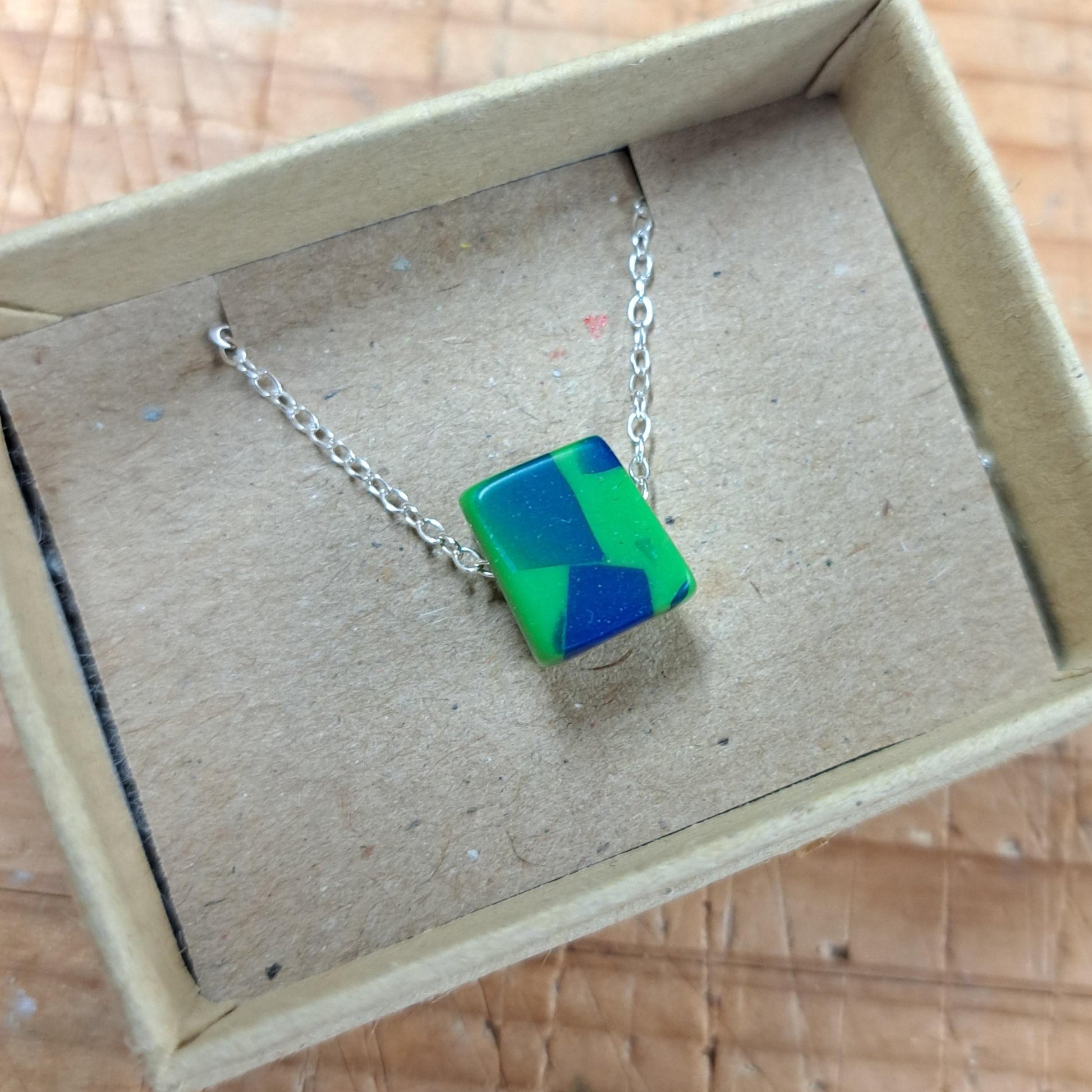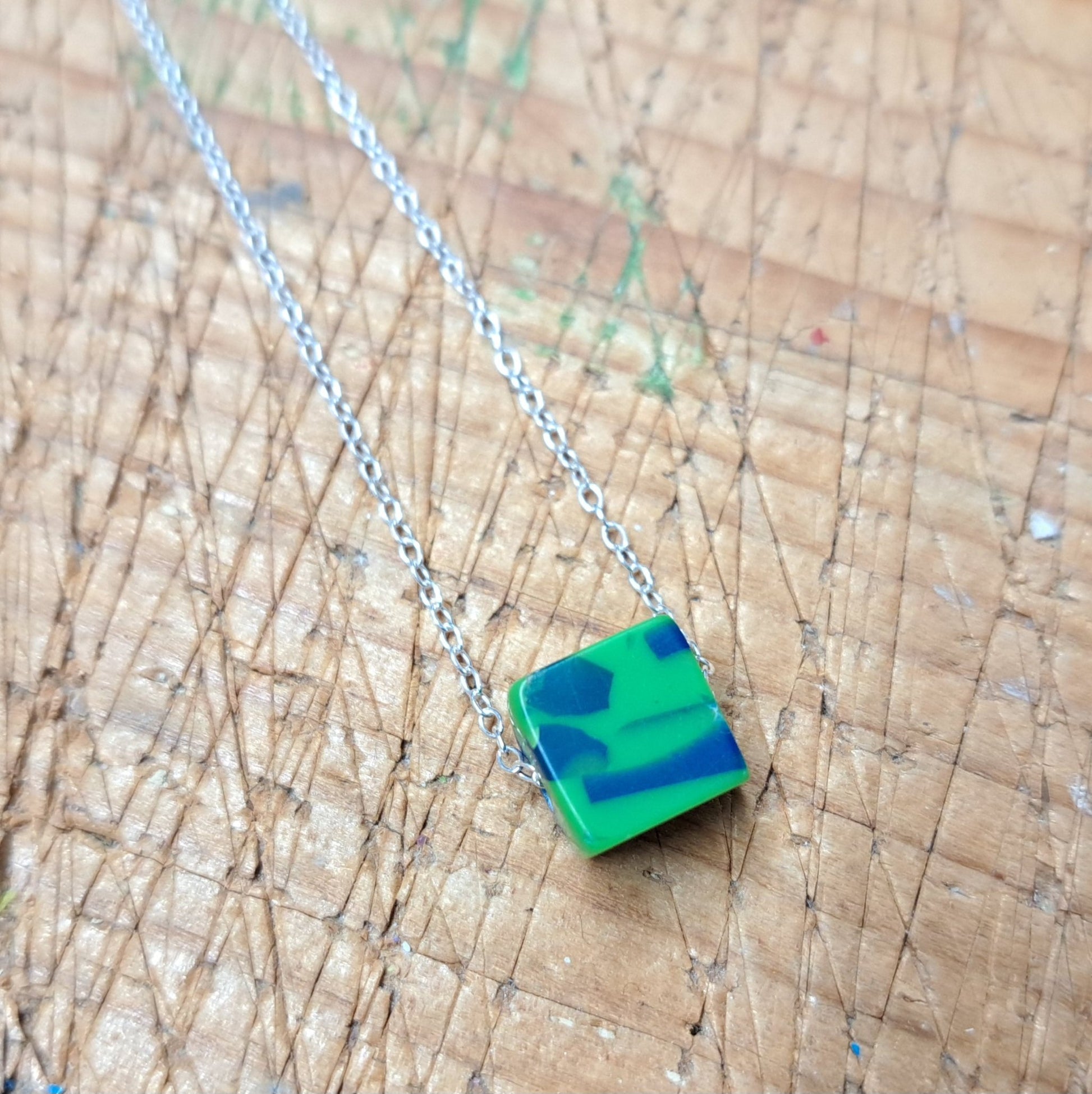 Green resin with a blue speckle pattern handmade by Carla Edwards.