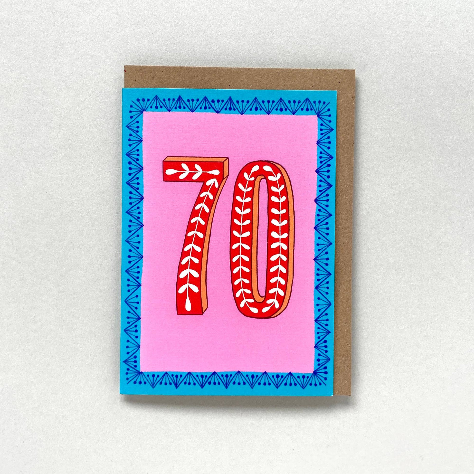 A cheerful bright pink 70th Birthday A6 greetings card by Maggiemagoo Designs