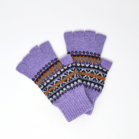 Beautifully knitted Fair Isle style half finger gloves in Heather/Violet produced in Scotland using the softest, high quality Lambswool.