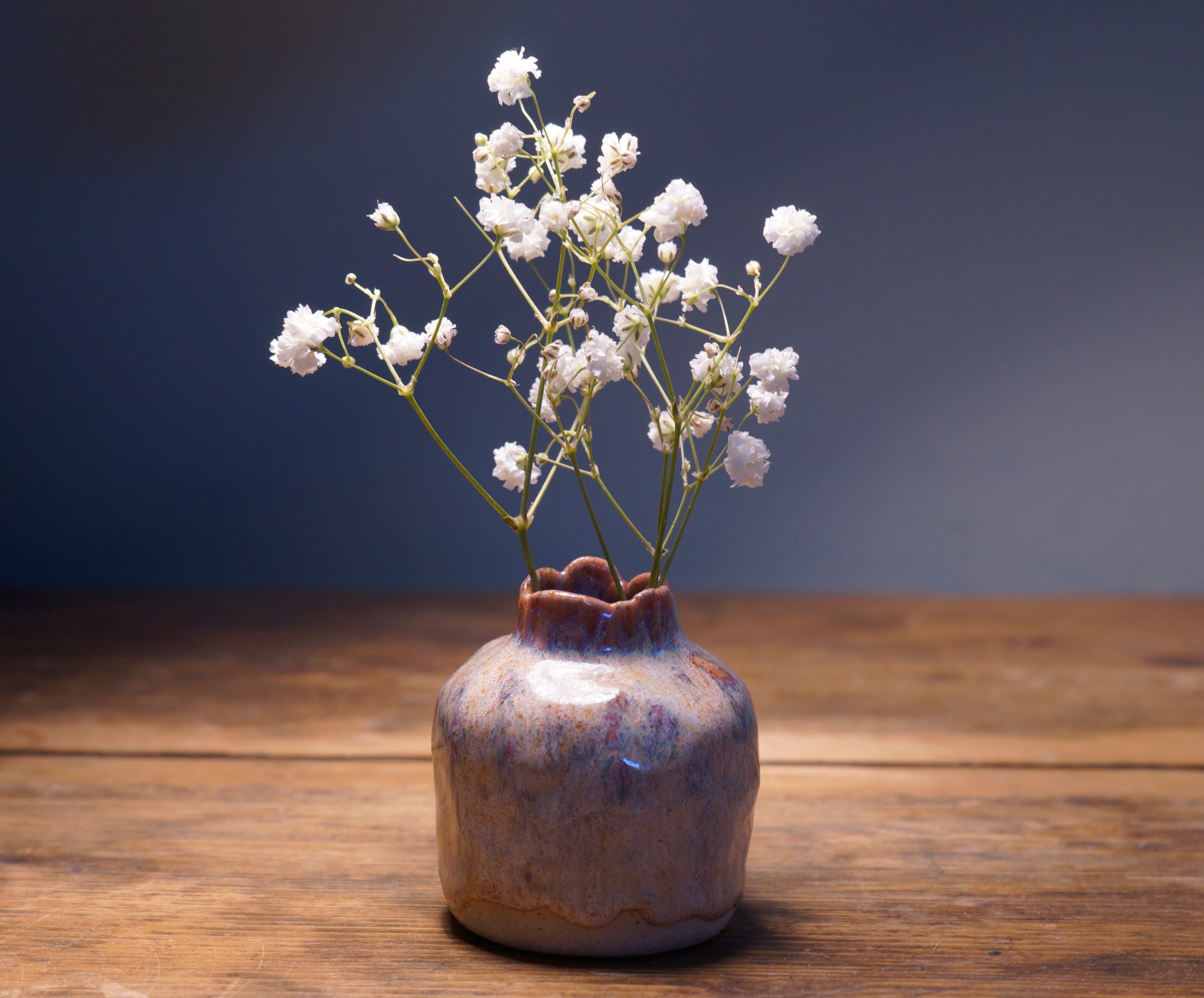 Round bodied bud vase featuring strong shoulders and a slightly fluted neck. Ideal for a mini bouquet. They are handbuilt using the technique pinching, giving them a lovely organic surface texture. Made with a flecked stoneware clay body and white speckle glaze. These vases are suitable for both fresh and dried flowers.