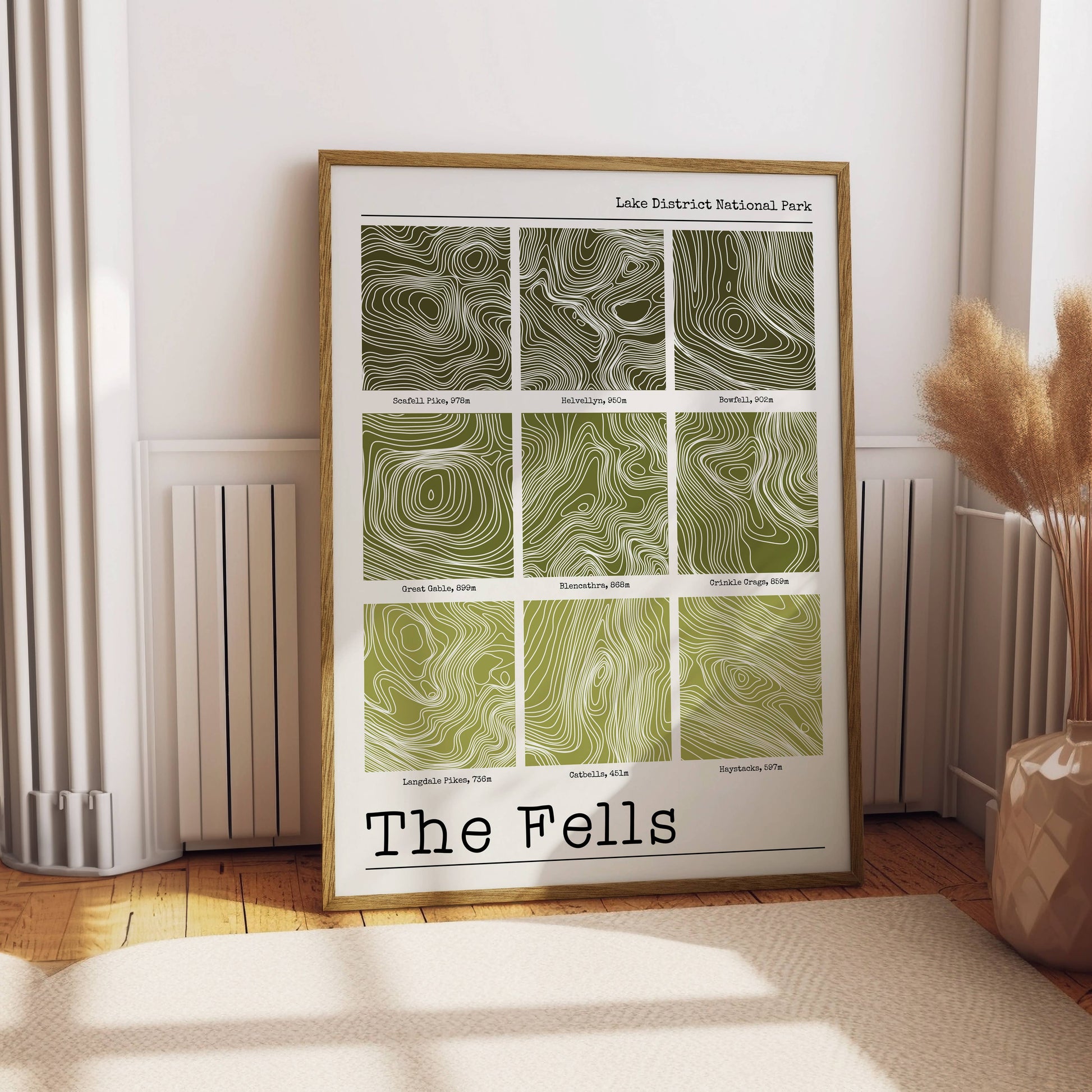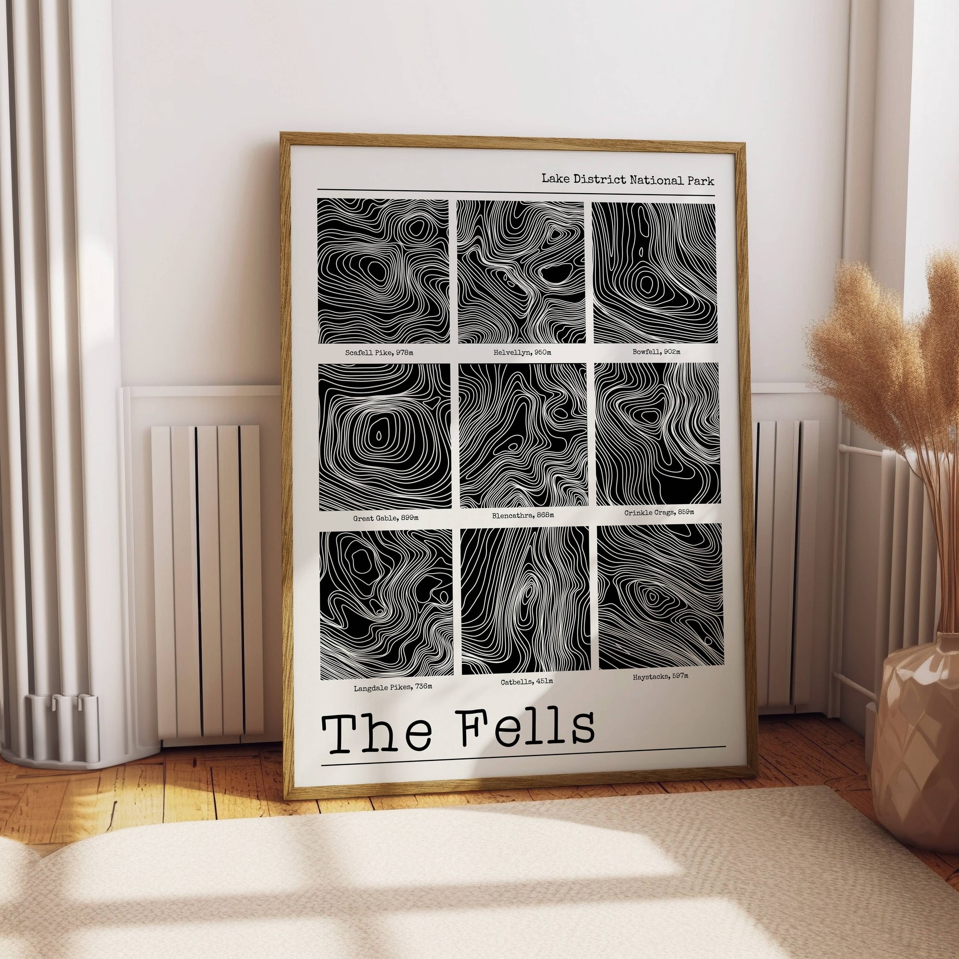 The Fells of the Lake District Print: The Fells of the Lake District is a hand-illustrated contour print celebrating nine fells located in the Lake District National Park.