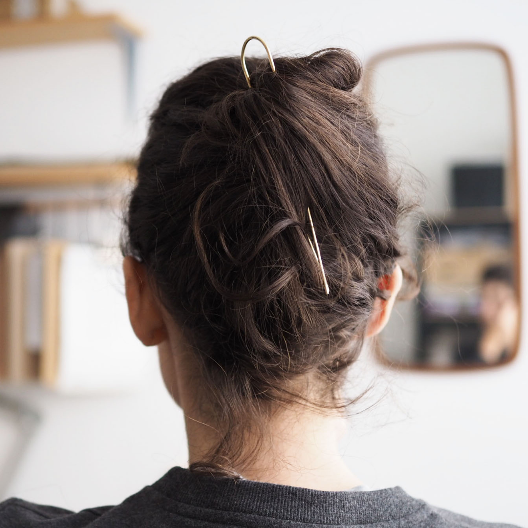 Simply twist your hair around the end of the pin and slide it through to secure (just like you did with a pencil at school, right?).