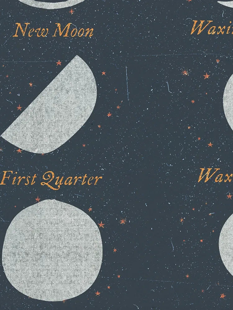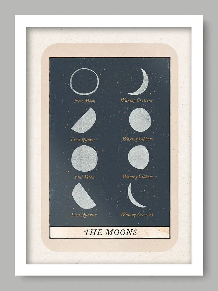 This illustrated art print is an observation of the lunar cycle and its phases.
