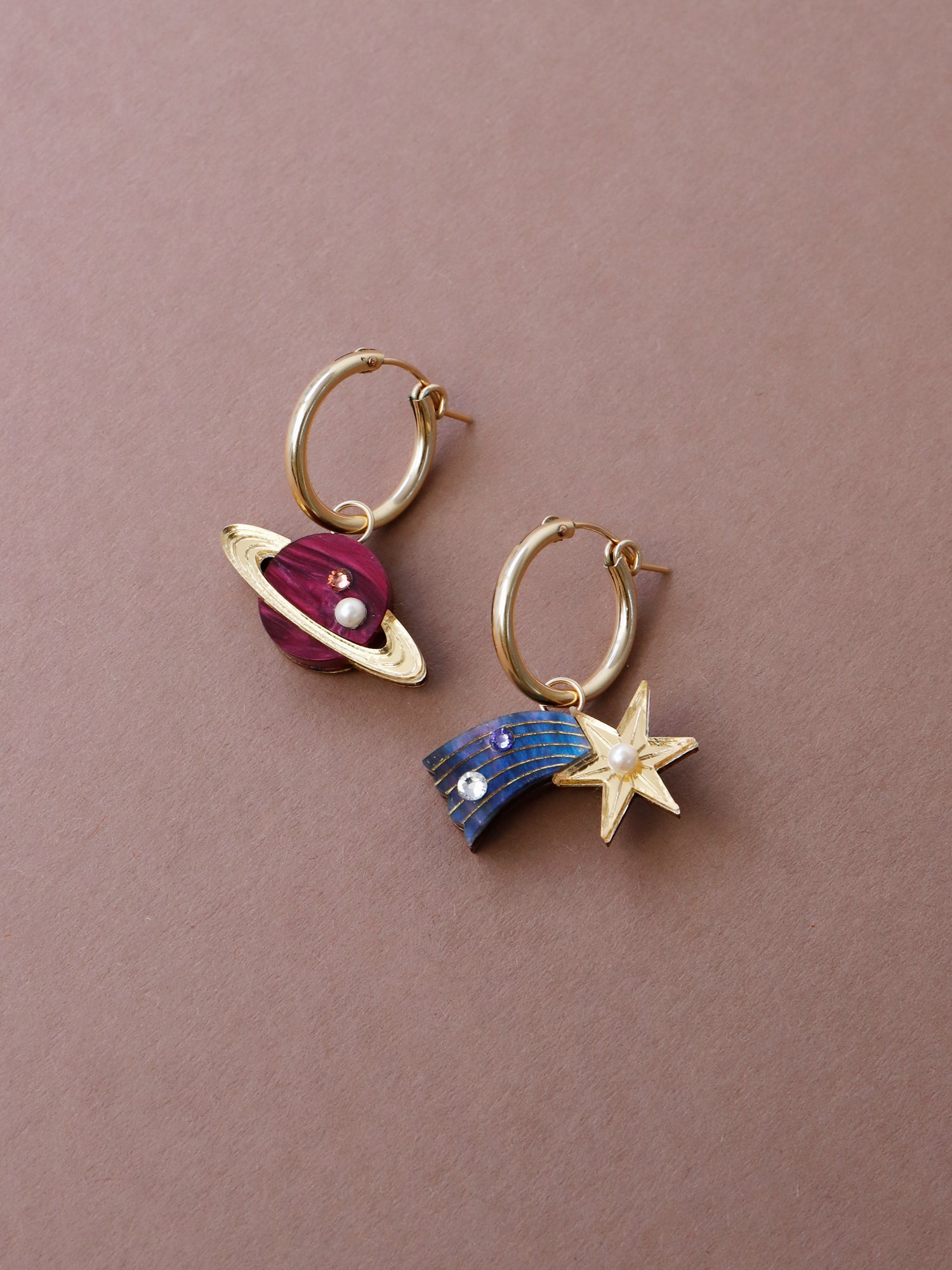 For those who can’t stop staring at the night sky! This dreamy mismatched pair is the best of both 'worlds': our Saturn and Shooting Star styles in one.