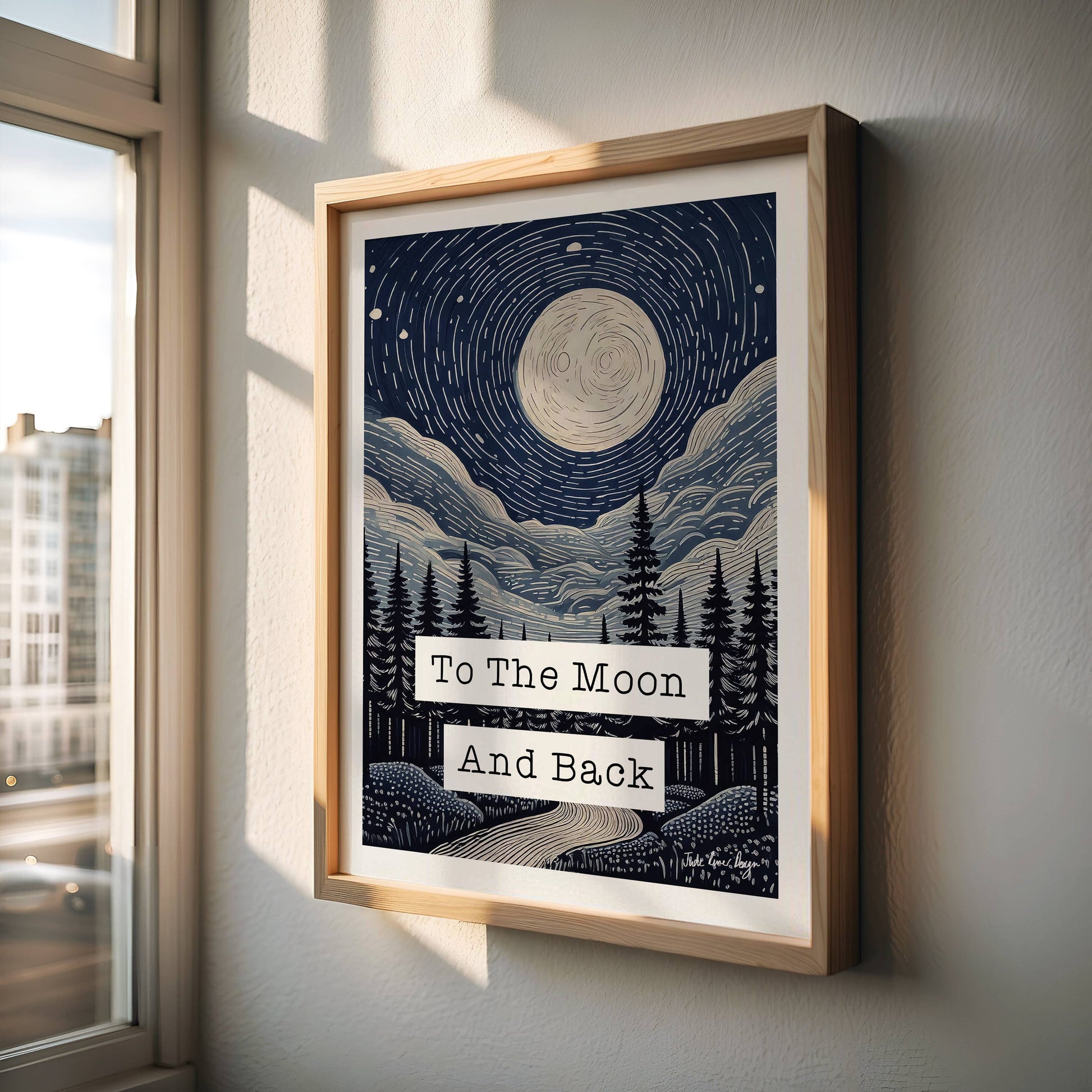 A beautiful digital lino print by Jude River Design, featuring the words "To The Moon And Back Print".