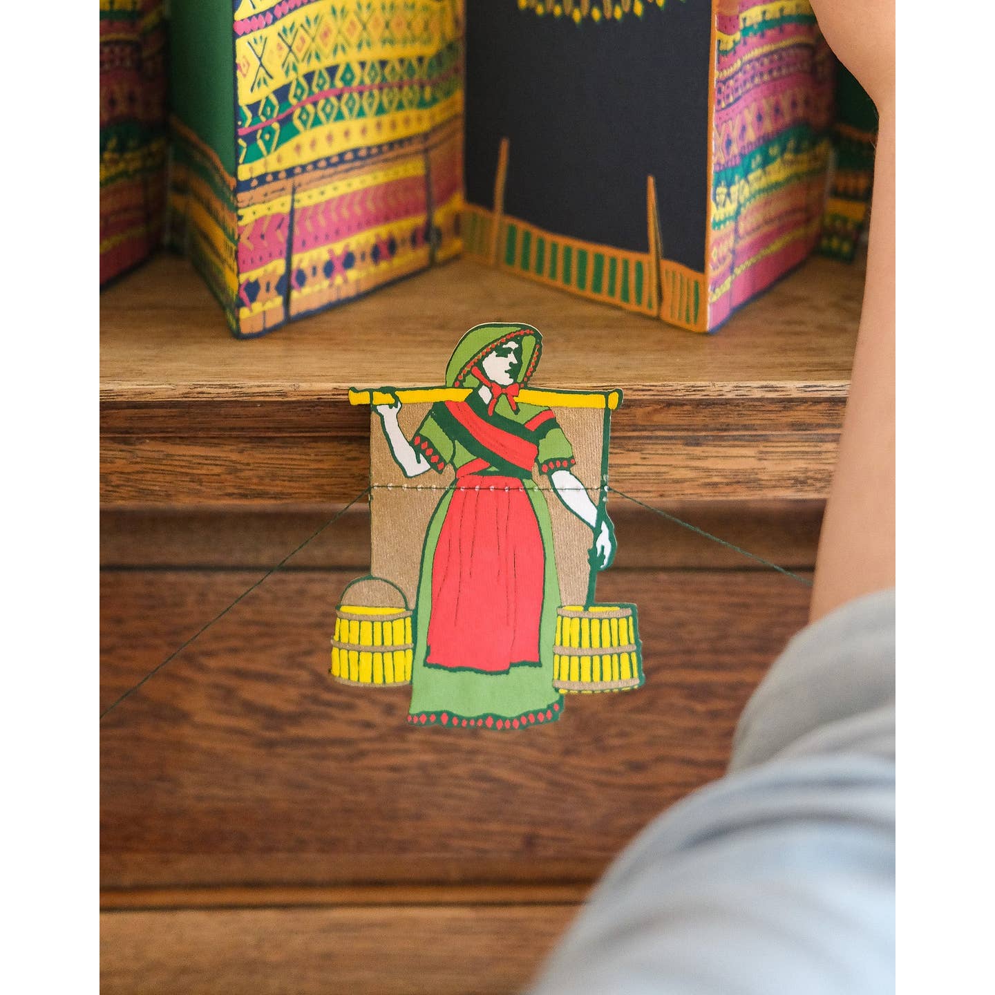 Hand printed three metre long paper garland, featuring screen printed images. The garland is printed on both sides on thick, hand made cotton paper. The shapes are sewn in a random order along strong cotton thread, with hanging loops either end, meaning the garland can be hung straight away