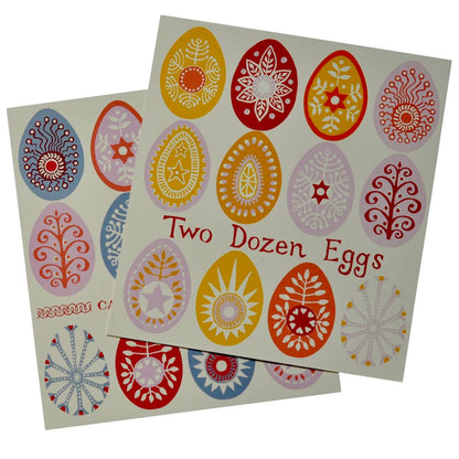 Two dozen assorted patterned egg decorations, made of 600gsm smooth ivory uncoated duplexed card, printed on both sides in hand-mixed colours.