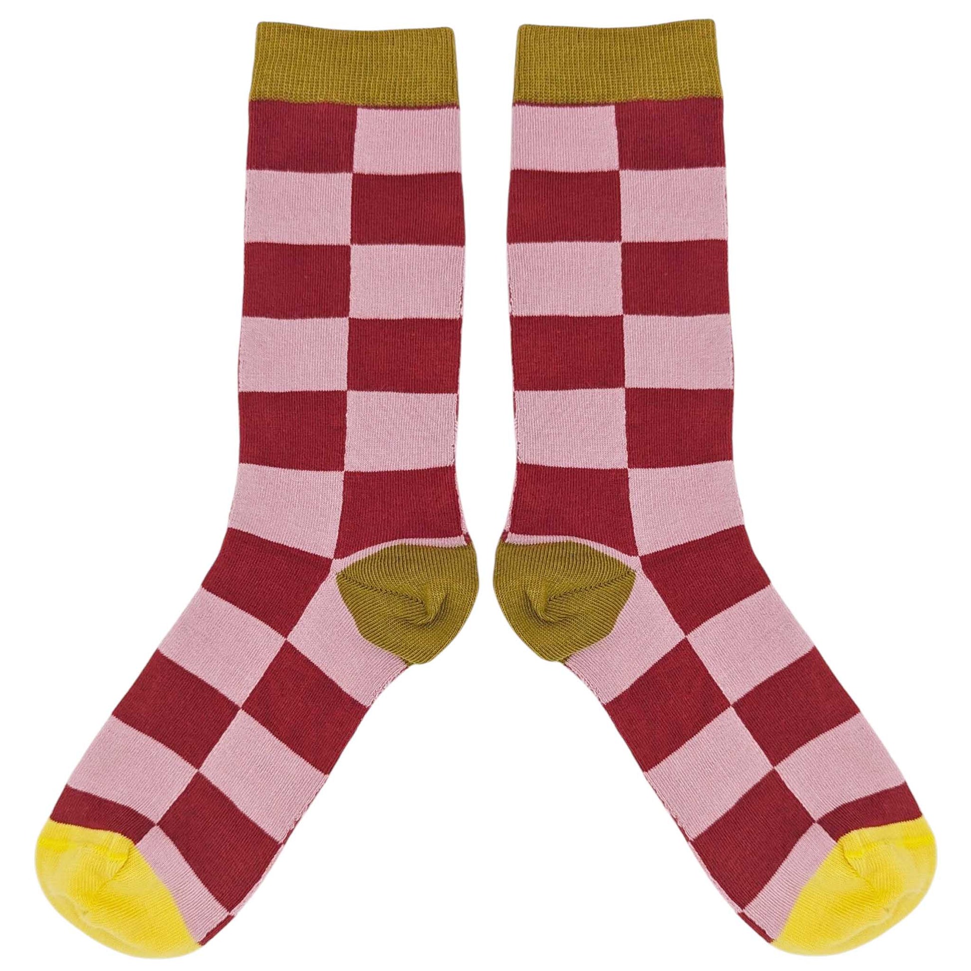 Women's Organic Cotton Crew Socks. Large Check - Red/Light Pink